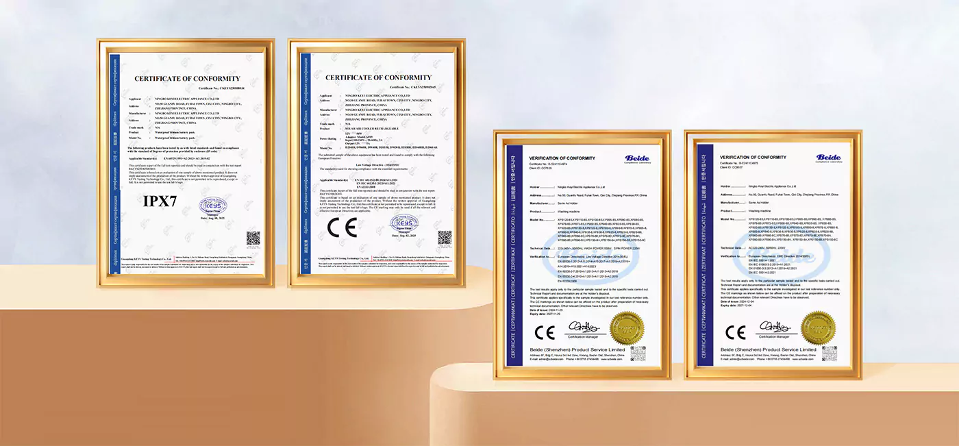 Unsere Waschmaschinen und Luftkühler haben die EU-Prüfnormen bestanden und die CE-Zertifizierung erhalten. Der Akku verfügt über die Wasserdichtigkeitsklasse IPX7. Wir sind auch als herausragender Verkäufer auf inländischen E-Commerce-Plattformen und Alibaba zertifiziert.